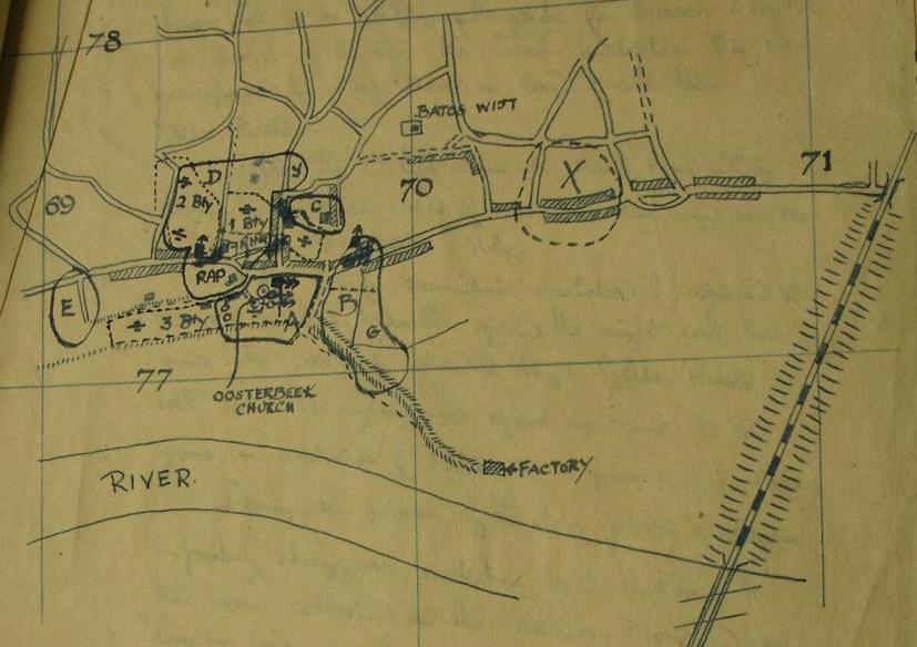 In the afternoon, I think through one of my F.O.O's, I was informed that a considerable body of disorganised infantry were retreating down the road from the direction of ARNHEM. I went forward in my Jeep and met them on the road about 706774. They completely filled the road and were in the main a mixture of S. Staffords and 11 Bn with very few Officers, Cain being the senior. They were then on the last piece of high ground EAST of the gun position. I halted them and ordered them to deploy where they were so as to cover the road from ARNHEM and the rd Junc at 703774. This seemed to do them good as an NCO in the 11 Bn said "Thank God we've got some orders at last now we'll be alright!" The S. Staffords had some Vickers and 6-pdrs. The Vickers were deployed covering the rly embankment, but it was difficult finding any good positions for the 6 pdrs. I left Cain to carry out the details of the deployment and returned to the gun area to get up ammunition and such food as we had in the dump. On the way I met Brig. Hicks and told him the situation and what I was doing. He ordered me to carry on and went forward to see for himself. He later came round my positions near the Church. I asked him for some more Officers and if possible some more men to give depth to the forward positions taken up by the S. Staffords and 11 Bn. He sent LONSDALE to take over comd of the fwd force and Maj Simmons (I am not sure of the spelling) with some S. Staffords he had in reserve to re-inforce the troops I had round the Church. This was a most excellent and gallant officer who was unfortunately killed later in the battle. Besides these re-inforcements he sent me a wireless set on his command net.