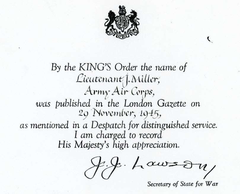 Notice of Lieutenant Miller being Mentioned in Despatches.