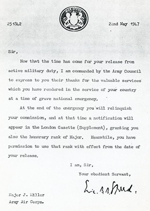 A letter confirming Major Miller's release from the Army.
