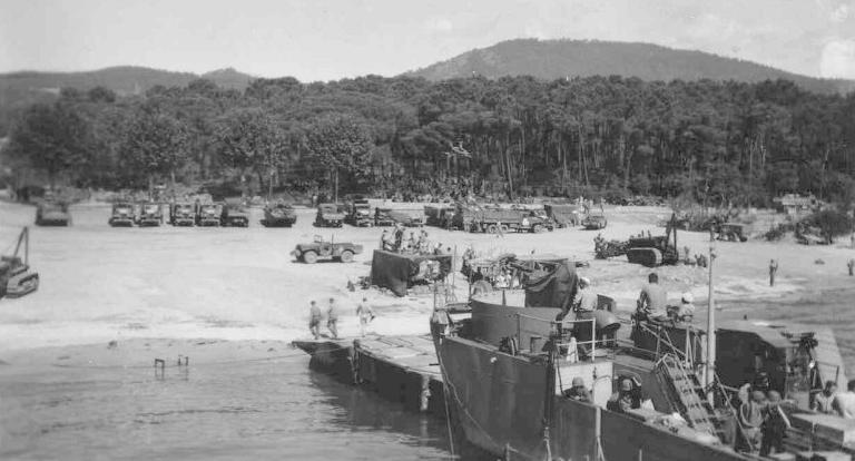 A landing ship being unloaded on Alpha Beach, near Saint Tropez.