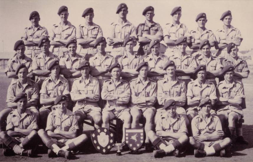 The 5th (Scottish) Parachute Battalion, the winning team at the Army Athletics Championship, Palestine 1946. Captain James Miller is seated third from the left, second row from the front. Larger image. Copyright: James Miller.