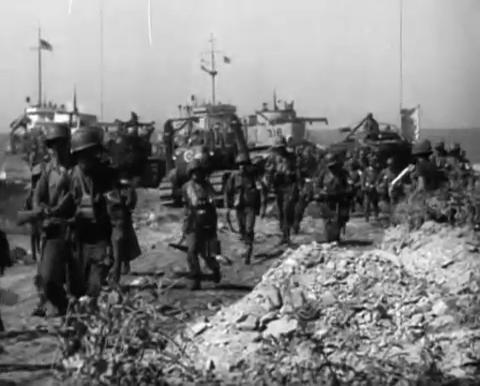 Soldiers marching off the beach.