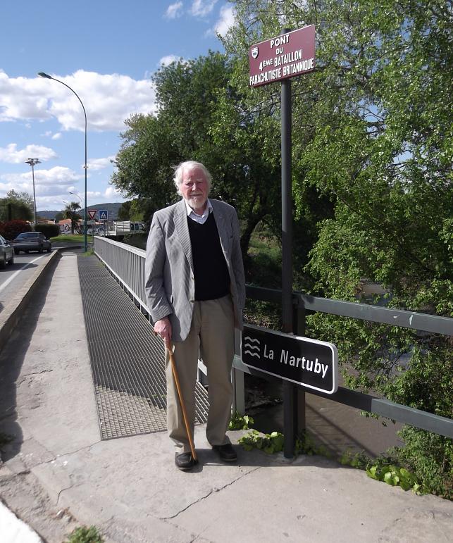 Major Dick Hargreaves on the 18th April 2012, standing on the bridge over the River Nartuby to the East of Le Muy, captured by the 4th Battalion on the second day of the operation, 16th August 1944. He was in France to participate in the filming of an episode of the BBC's Who Do You Think You Are programme, in which the actor Patrick Stewart was tracing the footsteps of his father, CSM Alfred Stewart, of the 2nd Parachute Brigade Defence Platoon. Copyright: Bob Hilton.