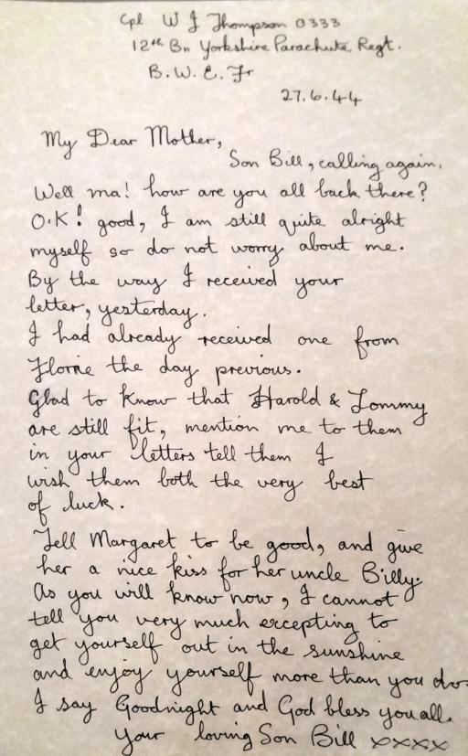 The final letter which Corporal Thompson sent to his mother. The Harold and Tommy mentioned are his brothers; Harold served in the Royal Navy aboard HMS Kent, Thomas Richard was in the Merchant Navy and served on the Arctic Convoys, both survived the war. Copyright: Harold Thompson.