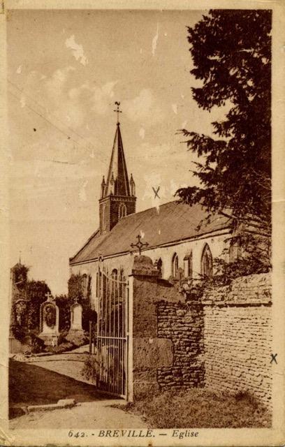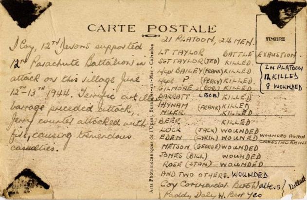 A pre-war postcard of Bréville Church with a list of casualties suffered by No.21 Platoon during the attack, as recorded by Thomas Hugh Jones. Copyright: Warwick Jones.