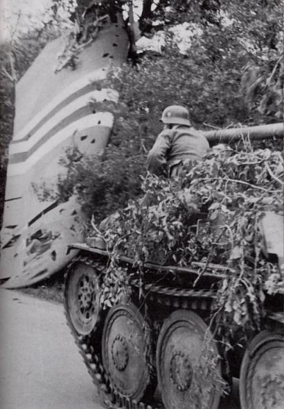 A Marder III self-propelled gun of the 21st Panzer Division, guided by a grenadier, nears Bénouville.