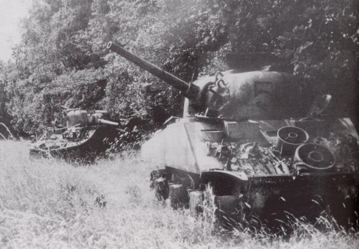 Knocked out Shermans of the 13th/18th Royal Hussars in the vicinity of the Bois de Mont. Copyright: Monsieur Courcy.