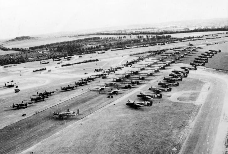 Tug aircraft and gliders preparing to take-off from RAF Brize Norton. Halifax tugs are lined up on either side of the runway, whilst on the runway itself are the large Hamilcar gliders with two Horsas at the front. Larger image.