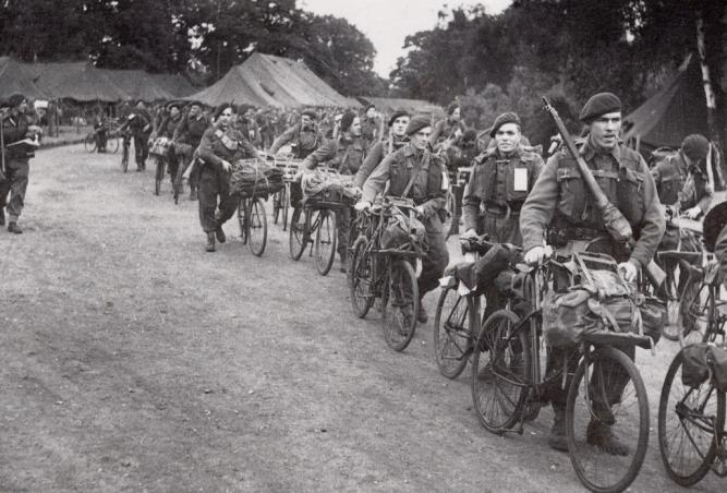 Commandos leaving their camp with bicycles for embarkation on the 3rd June.