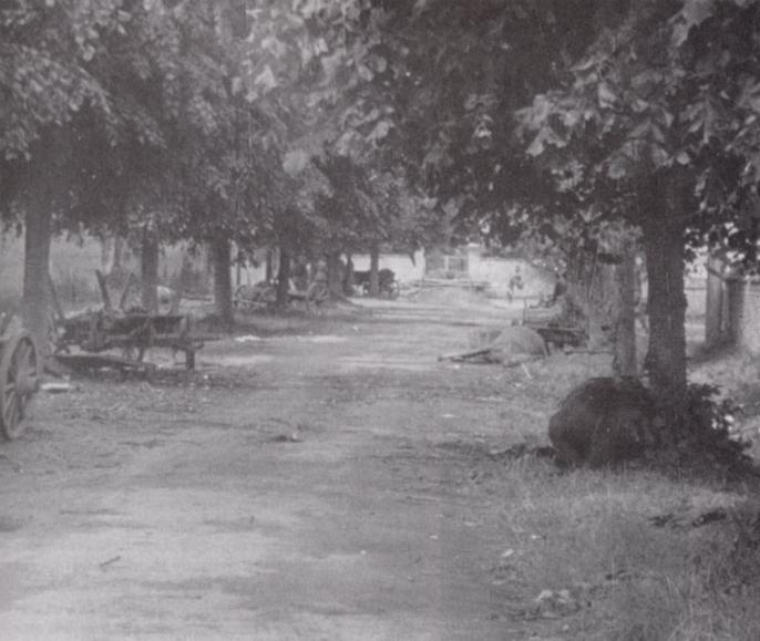 Dead animals and abandoned carts near the Chateau d'Amfreville. Copyright: IWM FLM/3457.