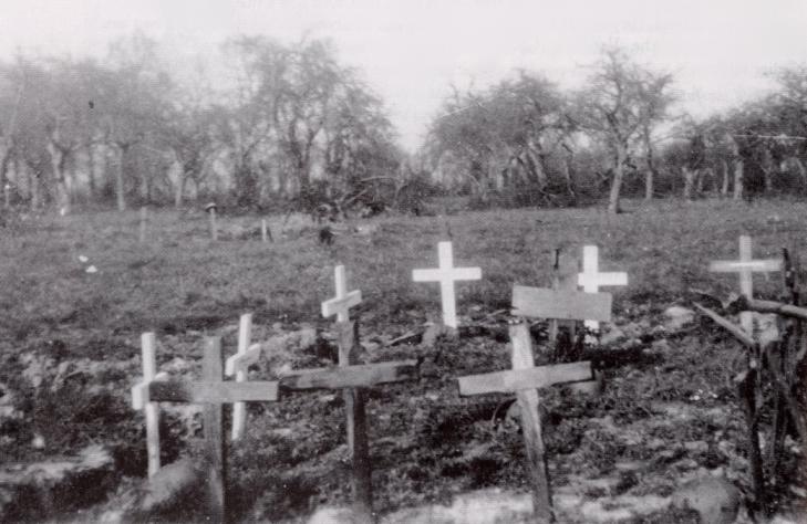The temporary field graves of 6th Airborne Division personnel killed during an Allied bombing raid. The group, mostly consisting of men of the 3rd Parachute Brigade, was under the command of Brigadier Hill when, at approximately 07:00 on the 6th June, they were mistaken for German infantry by Royal Air Force aircraft, who proceeded to attack then with anti-personnel bombs. Copyright: Gonneville Mairie.