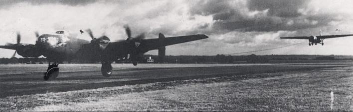 A Halifax towing a Horsa takes off from Tarrant Rushton. Copyright: Imperial War Museum.