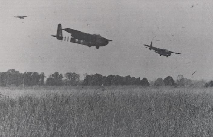 Three Hamilcar gliders, carrying the Tetrarch light tanks of the 6th Airborne Armoured Reconnaissance Regiment, about to land on LZ-N. Copyright: Airborne Forces Museum.