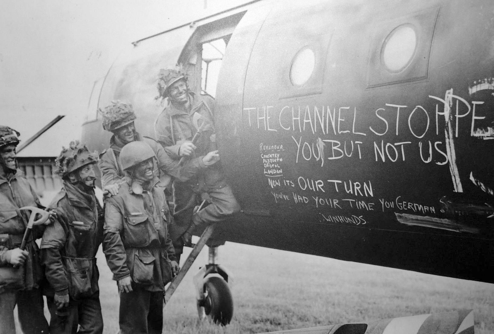 Soldiers about to depart with the Second Lift admire the decorated fuselage of their Horsa. Larger image.