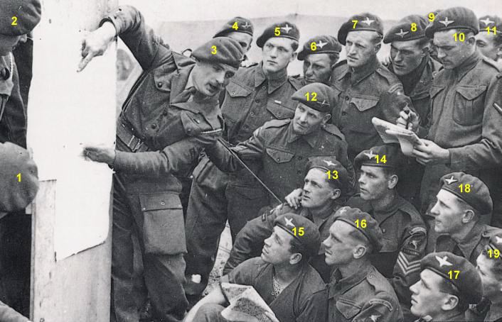 Lieutenant Bob Midwood briefs his platoon of the 22nd Independent Parachute Company for their pathfinding role in Normandy. Corresponding to the numbered faces on the photograph below - (2) Lance-Corporal Edward Delaney O'Sullivan, killed in action on the 6th June 1944; his body was found by two French youths at approximately 04:00, ten yards from the body of a dead German. It is believed that the two men shot each other simultaneously with their sub-machineguns. (3) Lieutenant Bob Midwood. (5) ? Gordon. (7) Sergeant Kidd. (8) Sergeant John Edmund Rixson. (12) Sergeant Smith. (13) Griff Thomas. (14) Sergeant Leverett. (15) Ray Povey. (16) R.A. Stoodley. (17) Frederick Arthur "Roxy" Lovatt. (18) Ken Norton. If you can identify any people on this photograph, please write to pegasusarchive@googlemail.com. Copyright: Imperial War Museum.