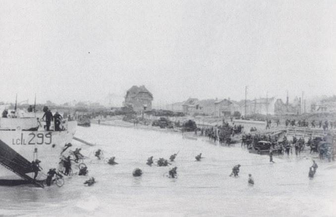 Men of the 9th Canadian Infantry Brigade, carrying bicycles, come ashore on Juno Beach, midday, 6th June. Copyright: Imperial War Museum.
