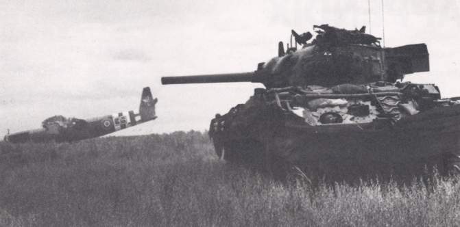 An abandoned amphibious Sherman, Duplex Drive, on one of the landing zones. A similarly discarded Horsa glider rests in the background.