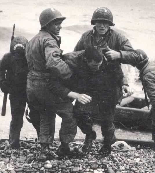 Soldiers help the survivors of a sunk landing craft ashore, their raft is visible to the right. Copyright: Hulton Getty.