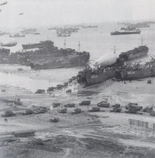 Allied shipping bringing masses of troops and vehicles ashore on Omaha towards the end of the 6th June. Note the barrage balloons floating overhead. Copyright: US Coast Guard.
