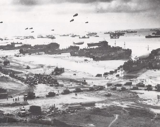 Ships unloading troops and supplies onto Omaha Beach.