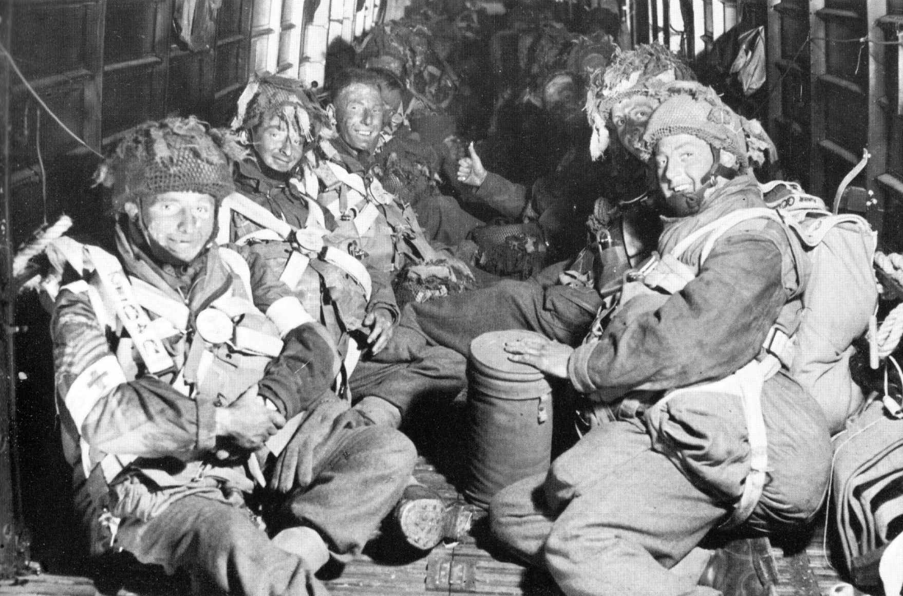 Paratroopers in good cheer en-route to Normandy. The man on the left is a medic. Larger image. Copyright: Imperial War Museum.