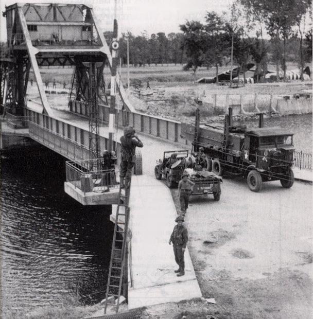 British ground forces on the western end of Bénouville Bridge, with the Horsa gliders of the coup de main assault still visible on the right.