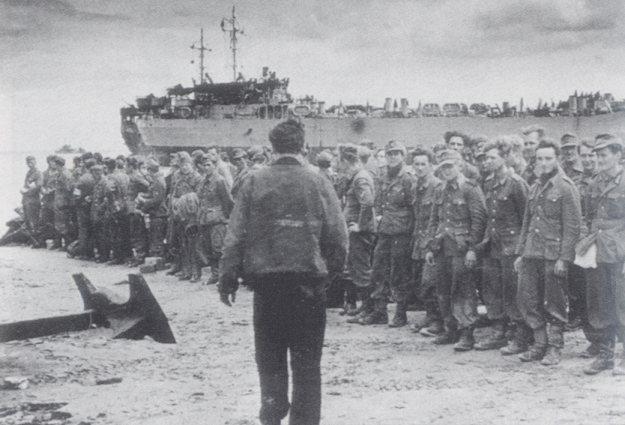 Polish and Czech prisoners of war, not at all unhappy about the change in their fortunes, line up on Utah Beach in preparation for their departure to England aboard the LST in the background. Copyright: US Coast Guard.