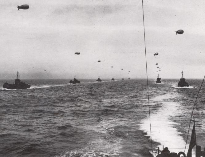 Landing Craft Infantry vessels, carrying US troops sail, to Normandy with barrage balloons overhead.