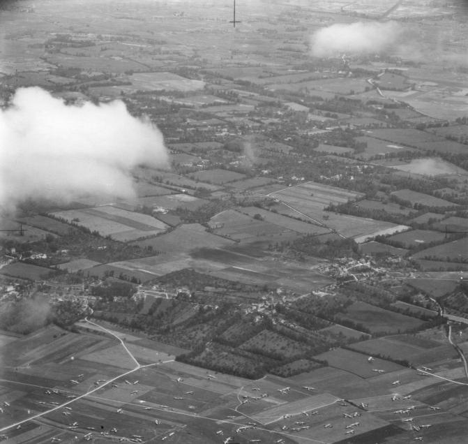An aerial reconnaissance photograph taking over the 6th Airborne Division's area on the 17th June 1944. It is thought that the photograph was taken over Ranville, facing in a north-easterly direction, with abandoned gliders on LZ-N and the high ground of the Le Plein-Bréville ridge clearly visible in the lower half.
