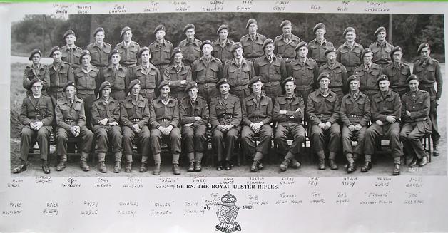 Officers of the 1st Battalion The Royal Ulster Rifles, Salisbury, July 1942. The names on the photograph were annotated by Huw Wheldon. Click here for a full-size (305kb) photograph.