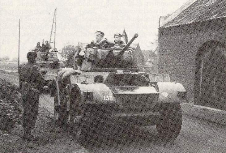The Reconnaissance Squadron of the 1st Belgian Brigade on the road to Pont L'Eveque. Major de Selliers (left in the armoured car) speaks with Lieutenant Grosjean, Second Lieutenant Totelin is on the right.
