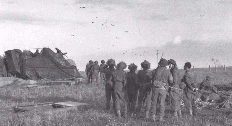 Troops of the 3rd Infantry Division watch the arrival of the Second Lift. Copyright: IWM B5046.