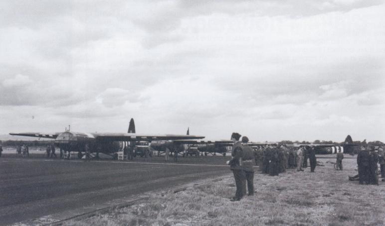 RAF Personnel and glider-borne troops wait for take-off beside Horsa gliders. Copyright: Imperial War Museum.