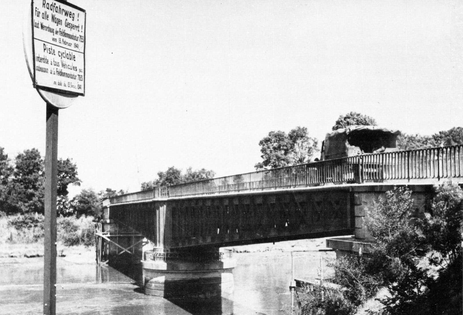 A supply truck passes over Ranville Bridge in the direction of Bénouville. Larger image. Copyright: IWM B5230.