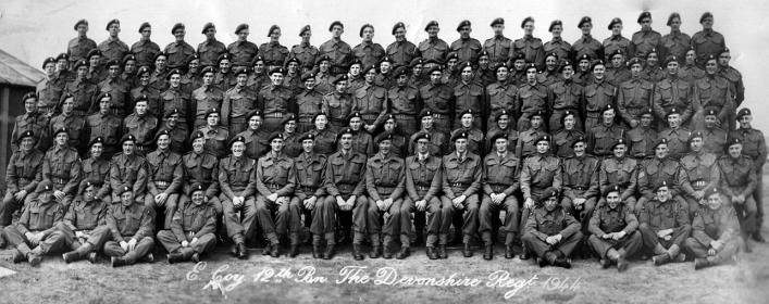 "E" Company, 12th Battalion The Devonshire Regiment. Corporal William "Bill" Brown stands at the far left of the third row from the front. Sergeant William Stevens is fourth from the right on the front (seated) row. Larger image. Copyright: Bill Brown.