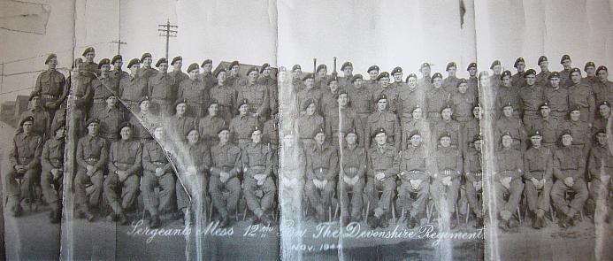 The Sergeants Mess, 12th Battalion The Devonshire Regiment, November 1944. Sergeant Victor Searle is first from the left on the second row from the back. Larger image. Copyright: Ann Brewer.