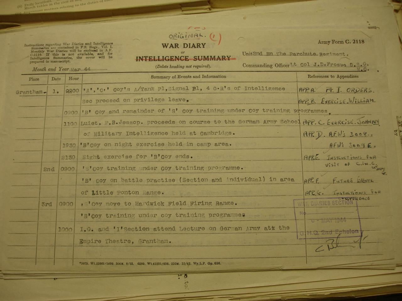 Over the years I have accumulated a near complete set of war diaries from the National Archives, covering the British Airborne Forces throughout the Second World War. This is a superb reference library, providing a daily record of everything that a particular unit was doing, whether in action overseas or training at home. Elements of these have been published on the website to help describe the various airborne operations, but this represents a mere fraction of the entire collection, which due to its sheer size, currently in excess of 23,000 pages, is unlikely to ever be made available on the site in any form.