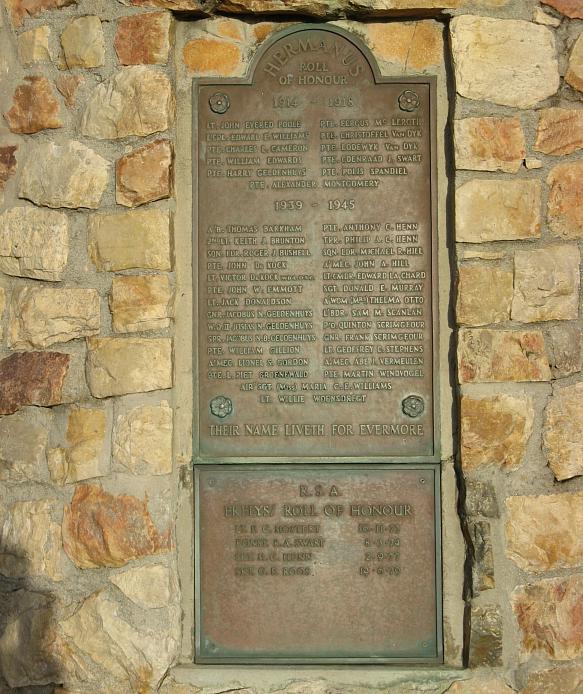 A war memorial in the village of Hermanus, South Africa. Roger Bushell's name is written on the third line on the left. Copyright: Freddy Philips.