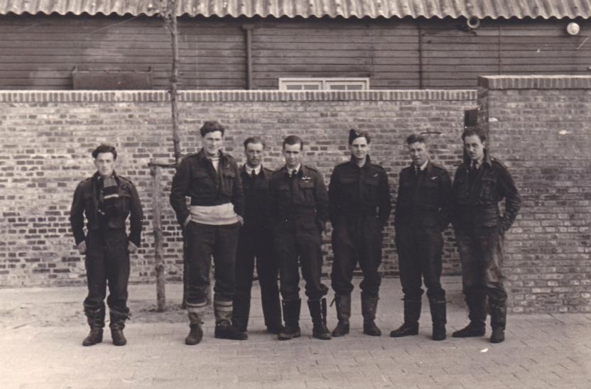 The crew of Short Stirling W.7471 MG-J of 7 Squadron, shot down over Holland on the 7th June 1942. Left to right: Sergeant John H. "Jack" Arnold (Rear Gunner), Sergeant Sidney John "Mac" MacNamara (Engineer), Pilot Officer Frank St. John "John" Travis (Wireless Operator), Flying Officer Norman Leslie "Buck" Tayler (Pilot), Sergeant Clarence Francis "Frank" Henigan (RCAF, 2nd Pilot), Pilot Officer Edward Joseph "Ted" Earngey (RAAF, Navigator), and Sergeant William Edward "Bill" Goodman (Front Gunner). Missing from the photograph is Flying Officer Harry Douglas Spry (Mid-Upper Gunner), probably because he had sprained his ankle on landing. All were subsequently sent to Stalag Luft III for a time. Copyright: Gill Chesney-Green.