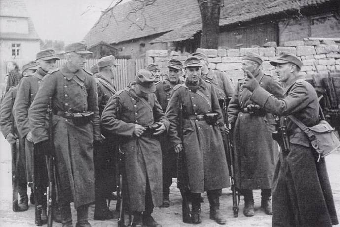 Elderly German soldiers preparing to escort a column of prisoners.