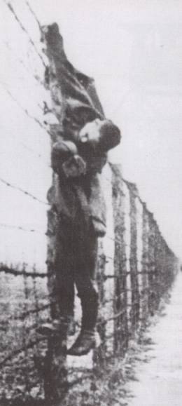 A Russian prisoner who was shot dead whilst attempting to escape over the wire. His body was left hanging where it had become snared as a warning to others.