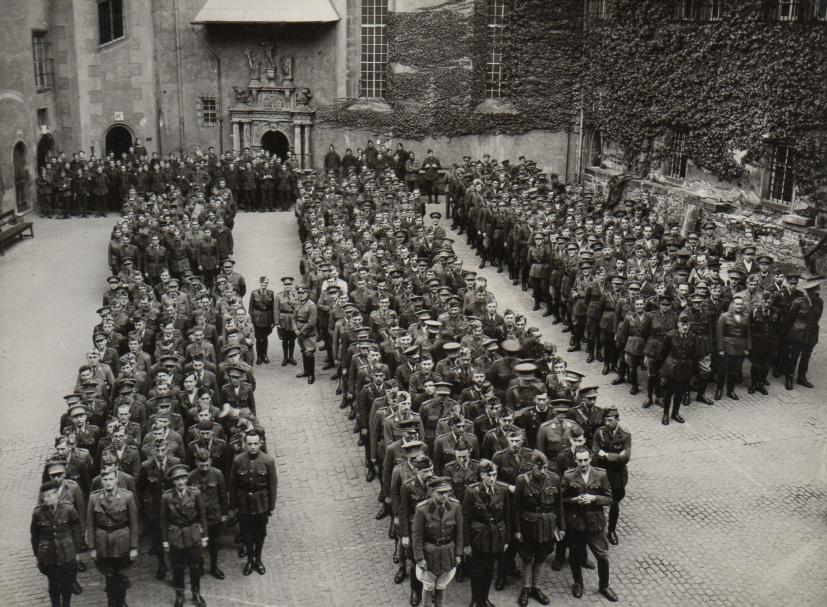 The French prisoners mark Bastille Day. The British and the French prisoners were well noted for undermining German authority by turning up for roll calls in all states of undress and disorder, but events such as Bastille Day and King George VI's birthday saw them become impeccable in their turnout. J. J. C. Becquet of the Belgian Army is standing second from the left in the front row of the middle column. Copyright: Tim Giddings.