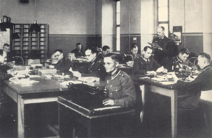 Censors checking prisoners letters home.