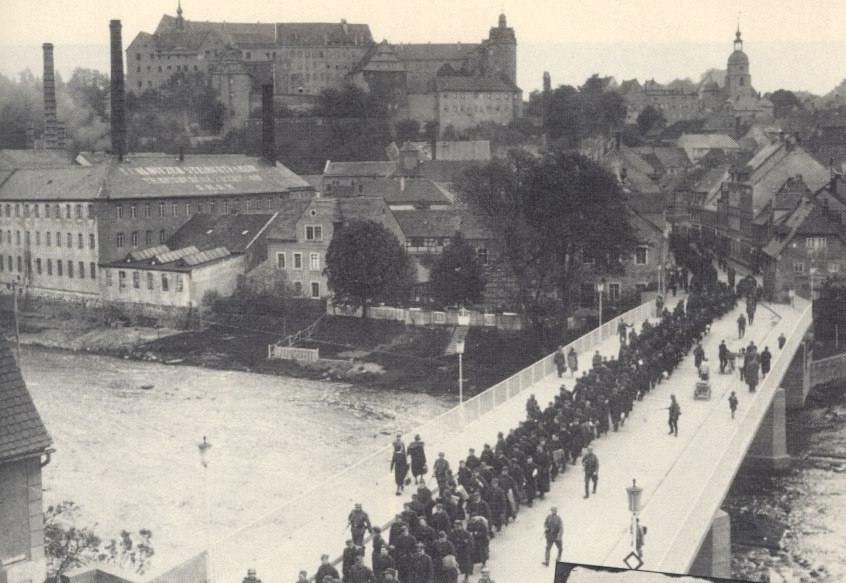 French POW's being marched across Colditz bridge in July 1943. A short time previously it had been decided to turn Colditz into a camp for British and American troops only, and so the French, Belgians, Poles, and Dutchmen were sent elsewhere. Not wishing to pass up an attempt to make mischief, three British prisoners swapped places with three Frenchmen who remained behind, but they were later returned.