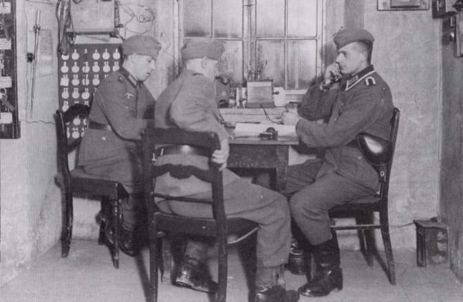 The guardroom on the ground floor. Attempts by the prisoners to escape, by disguising themselves as workmen or guards, often did not progress beyond this room due to the brass discs hanging off the board to the left. Each disc was numbered and these were issued to every guard or workman who entered the prisoners' courtyard. The number was recorded and checked when the person left, and anyone not in possession of a disc was placed under immediate arrest.