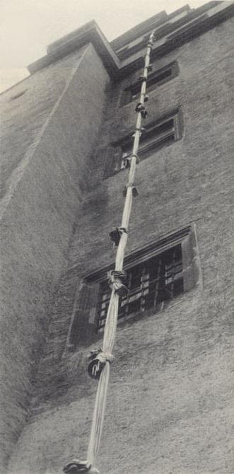 The attempt by the two Poles, Lieutenants Miki Surmanowicz and Mietek Chmiel, to abseil down a 120 foot wall to their freedom. To get themselves into position, both men arranged to have themselves thrown into solitary confinement. From here, Surmanowicz dismantled his bed and stool and used them to lever up his cell door a fraction at a time. It took him two hours to get the door to the level where he could slide himself underneath, whereupon he picked the lock on Chmiel's door. They found their way into the courtyard where fellow prisoners lowered them a rope formed out of bed sheets. They climbed up and braved a narrow ledge until they were able to jump onto the roof of the guardhouse. Finding an open window on the outer wall they tied the rope to it and proceeded to make their way down to the bottom, but as they neared the ground a German guard was alerted to the noise of Chmiel's boots on the wall and they were returned to their cells.