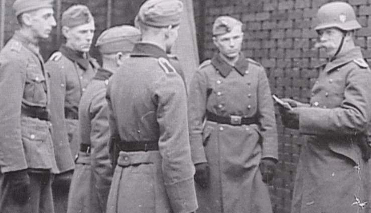 Stabsfeldwebel Rothenberger, known to both prisoners and guards as Frans Josef, with his sentries.