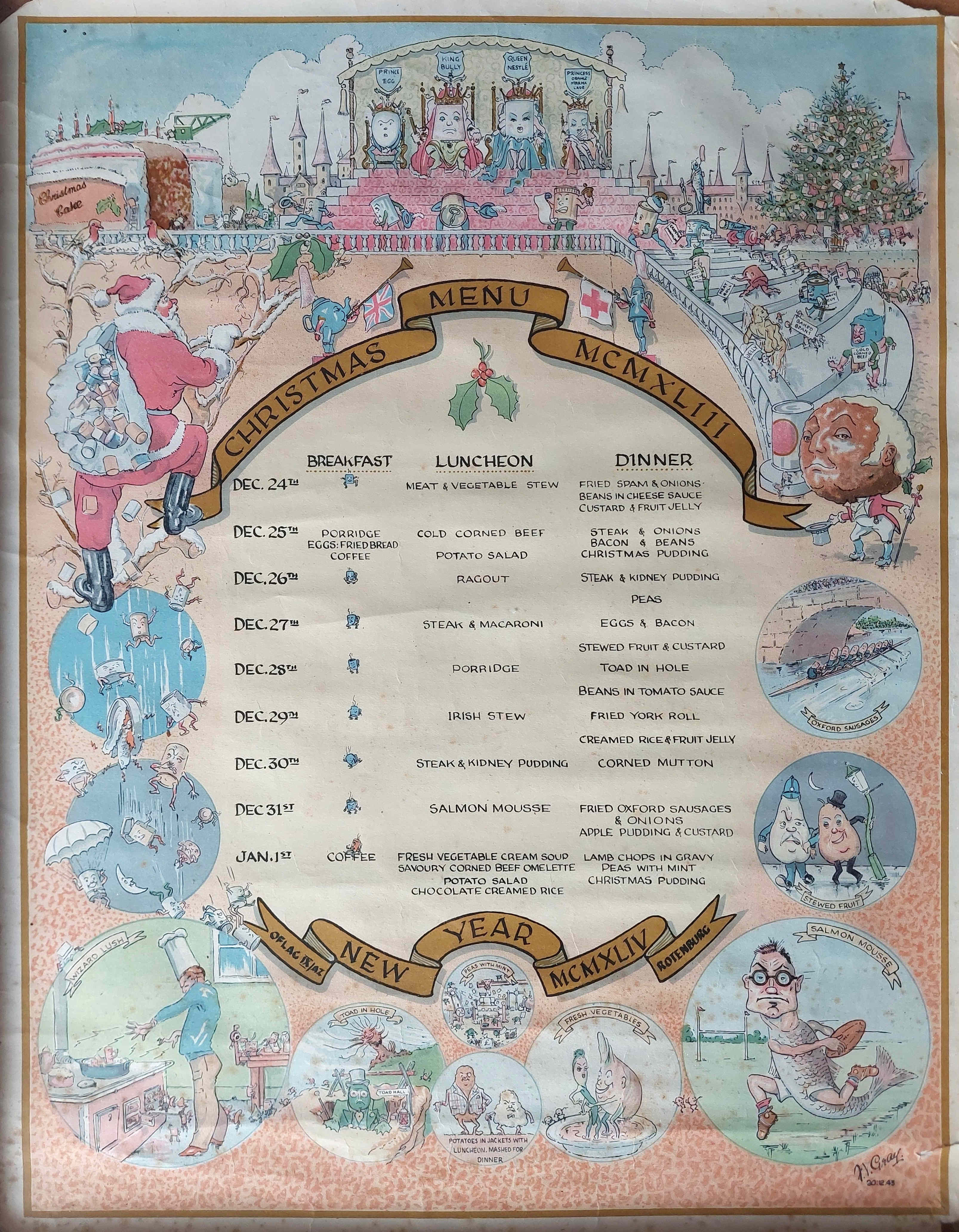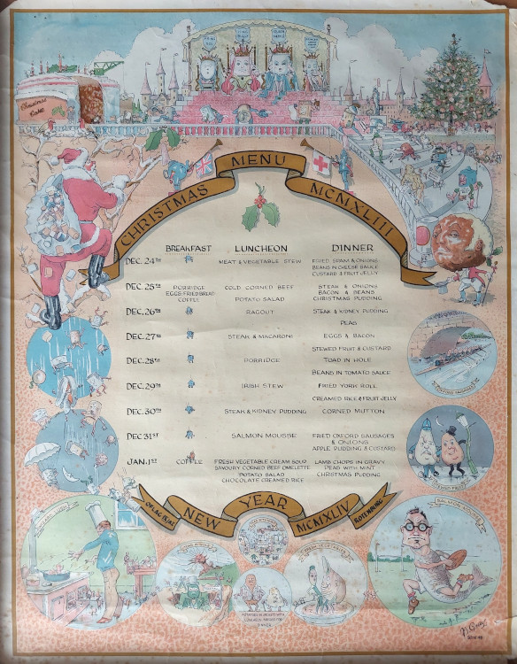 The 1943 Christmas Menu, brought home by Lieutenant Rollo H.S. Haydon, who served with the 170th Tunneling Company, RE, and was captured at Cap Gris Nez, near Boulogne, on the 26th May 1940. Larger image. Copyright: Simon McCarthy.