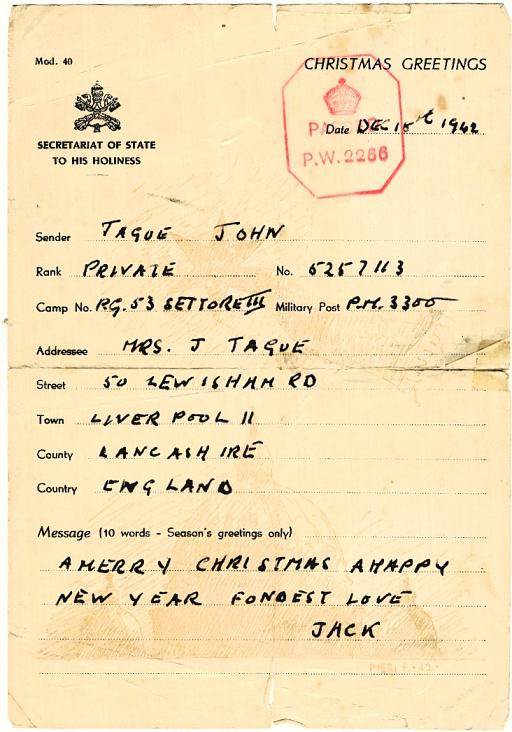A Christmas Card sent home from John Tague in P.G. 53. Copyright: John Tague.