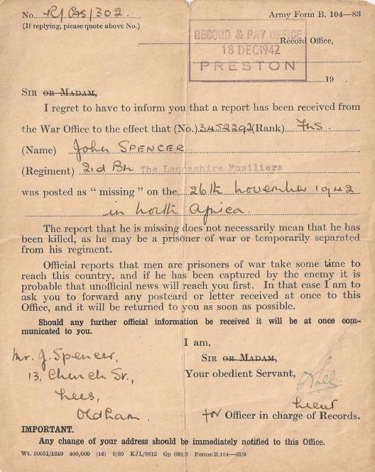 A document declaring Fusilier John Spencer as missing in action. Copyright: Brian Finch.